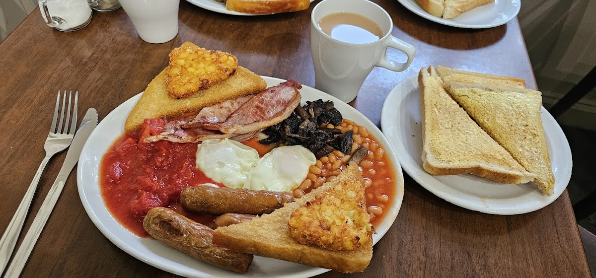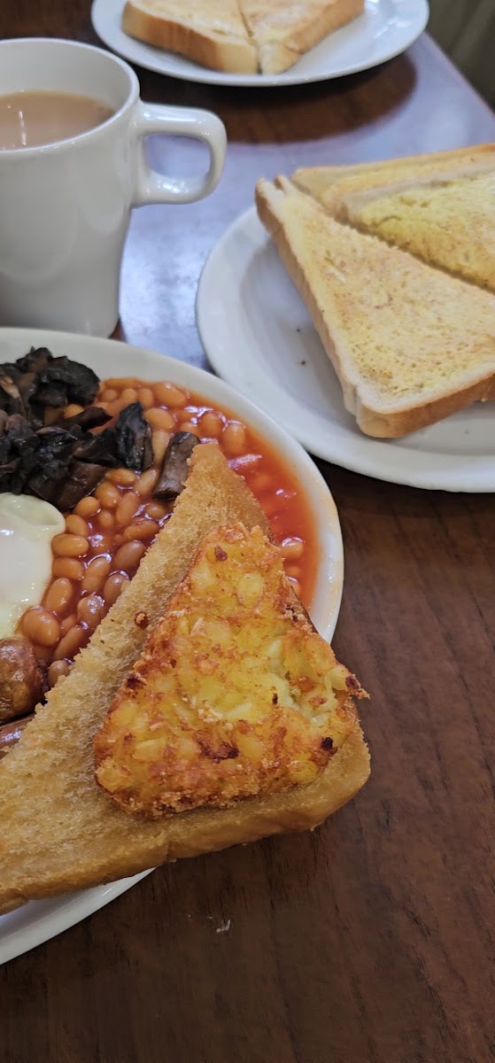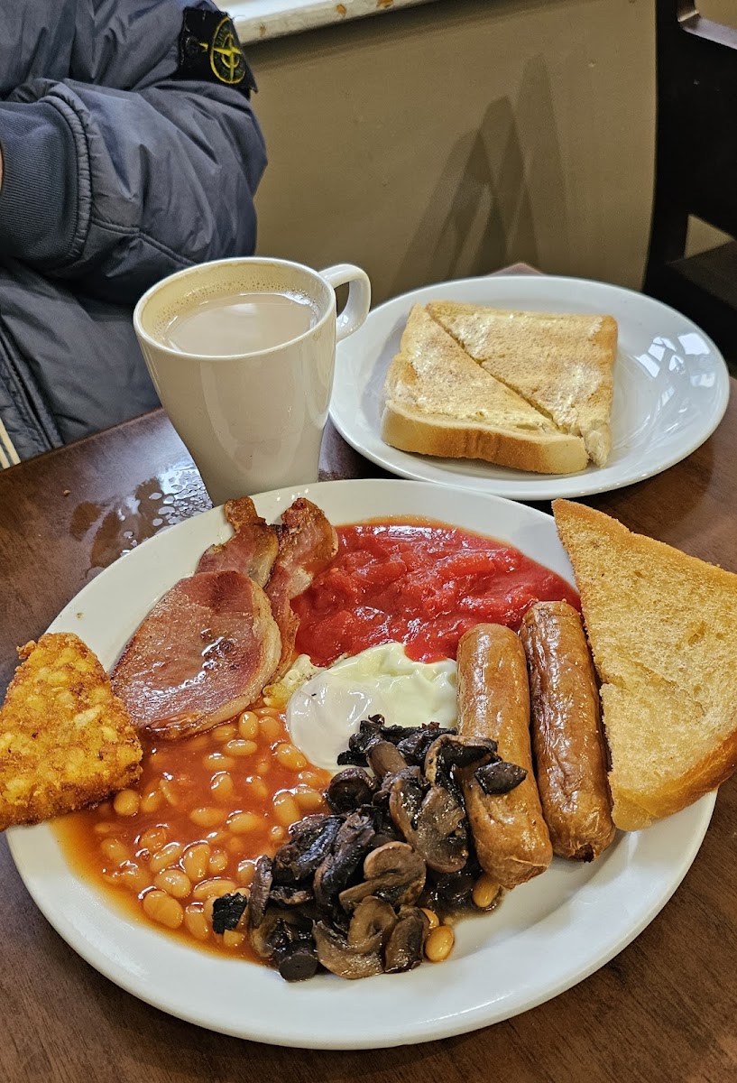Breakfast. A well established cafe located Banks Yard. The menu is on a blackboard behind the counter as you walk in. There's daily specials as well as burgers, toasties, jacket potatoes, and kids' meals. But we're here for, you guessed it, breakfast. There's a small breakfast at £6.50 for the lightweights. Or what we chose : Large breakfast £7.50 2 x Bacon,2 x sausage,1 x egg,1x hash brown, beans, tomatoes, mushrooms,fried bread, and toast. Of course, we had to have The Belly Buster £9.50 3 x bacon,3 x sausage,2 x egg,2 x hash brown, Beans,tomatoes,mushrooms, fried bread, and toast. Both breakfasts include a tea or coffee with a refill if you want one. Our order arrived at the table pretty quickly and was served by one of the lovely ladies even though they were quite busy. We left with full satisfied bellies that didn't break the bank as it's very good value. Support your local independents and give the chains a miss,it's much more appreciated.